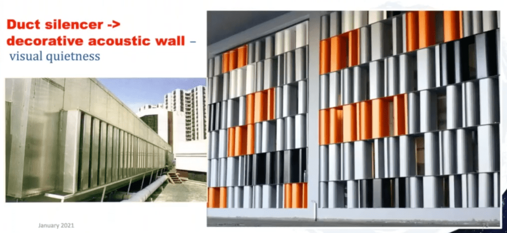 What is this psychological effect? The quietness definition shall be redefined – redefined with a low sound pressure level and the visual element. The exposure of the noise barrier outside the facade to the passers-by guarantees the feeling of quiet. The noise barrier function now has unified – to hide the hideous noisy traffic from hearings and eyesight. One example is the noise barrier along railways and highways. The role of unification here is to create a harmonious society.