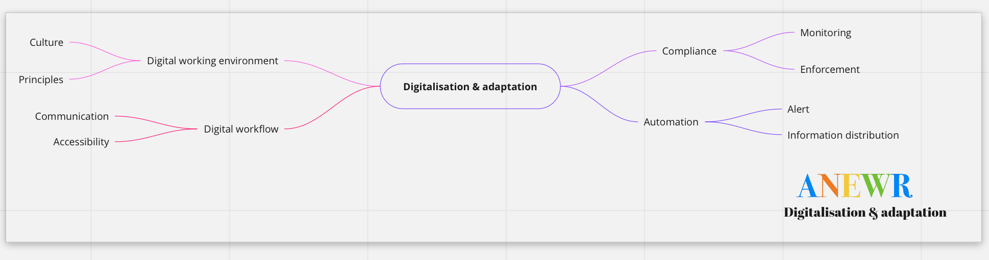 Conceptually, there are two sides of the same coin – this is the way we leverage the power of digitalisation in environmental monitoring. On the left-hand side (in digitalisation & adaptation diagram below) are the principles and culture to cultivate the digital working environment as well as the need for communication and accessibility through the whole workflow facilitating the operation from the start to the end. On the right-hand side are practices implementing the principles and the workflow set by the management. They are the monitoring and enforcement tasks, the alert and information distribution to the stakeholders involved in the project. Both sides are reflective of each other. The culture and the principles will affect the function-in-charge attitude towards monitoring and enforcement, whether strictly followed or disciplined. Conversely, looking at the opposite side, the alert and information distribution functional elements mirror communication and accessibility.