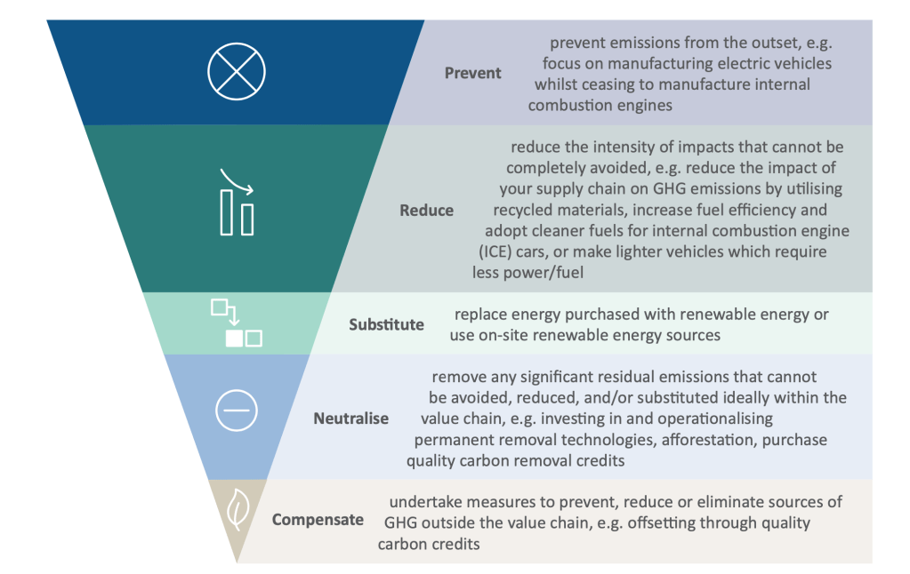 Internally, both top-down and bottom-up act together to guide the target setting. From top-down to set the target of boundary, select the base year to monitor, the year to meet the target, to bottom-up to define the hierarchy of actions and mitigations by Prevent, Reduce, Substitute, Neutralise, and Compensate.