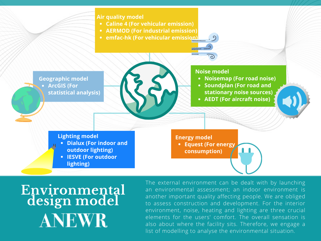 The external environment can be dealt with by launching an environmental assessment; an indoor environment is another important quality affecting people. We are obliged to assess construction and development. For the interior environment, noise, heating and lighting are three crucial elements for the users’ comfort. The overall sensation is also about where the facility sits. Therefore, we engage a list of modelling to analyse the environmental situation.