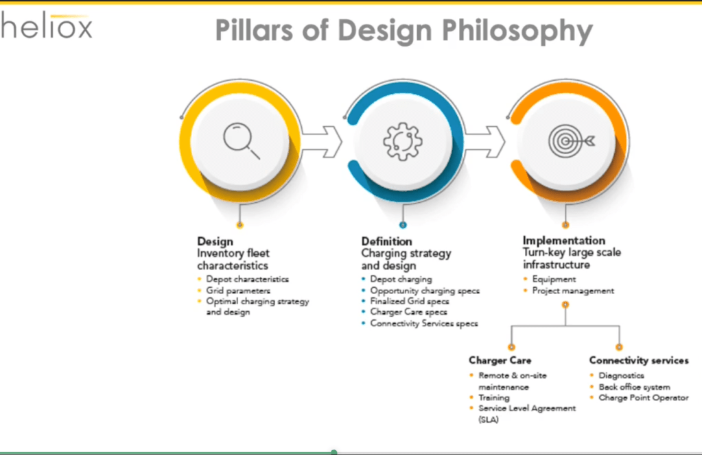 The Pillars of Design Philosophy segments different stages of building an EV compatible program. Each step has to meet certain specifications to implement the EV infrastructure – whether the grid can support the EV facilities, the depot characteristics, what charging strategy is suitable, the connectivity, equipment and maintenance such as charger care and connectivity services. All of these explains well the likely high cost incurred for EV adoption and the difficulty.