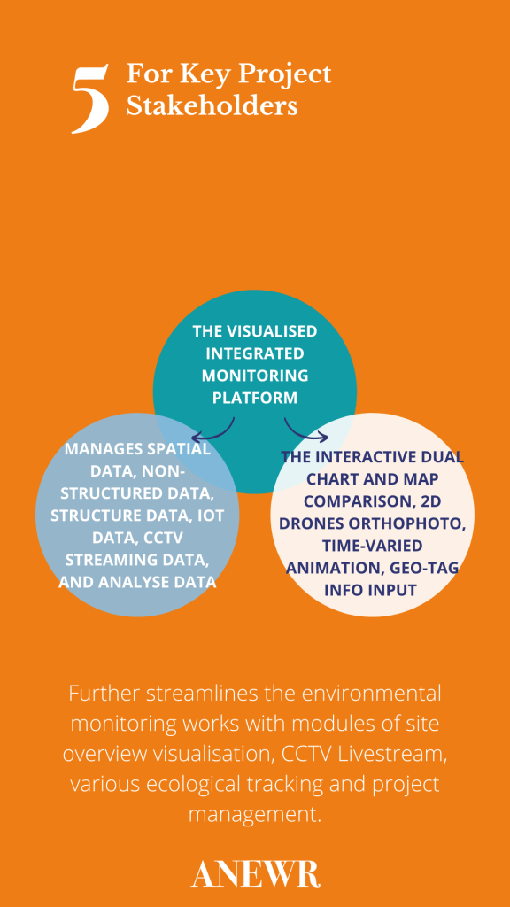The integrated environmental monitoring platform is the communication bridge between the IoT device and the project stakeholders. The system tracks the critical events. The project proponent applies rules to alert key stakeholders if over the limit. The platform can also be enhanced with visualisation. The visualisation further streamlines the environmental monitoring works with modules of site overview visualisation, CCTV Livestream, various ecological tracking and project management.